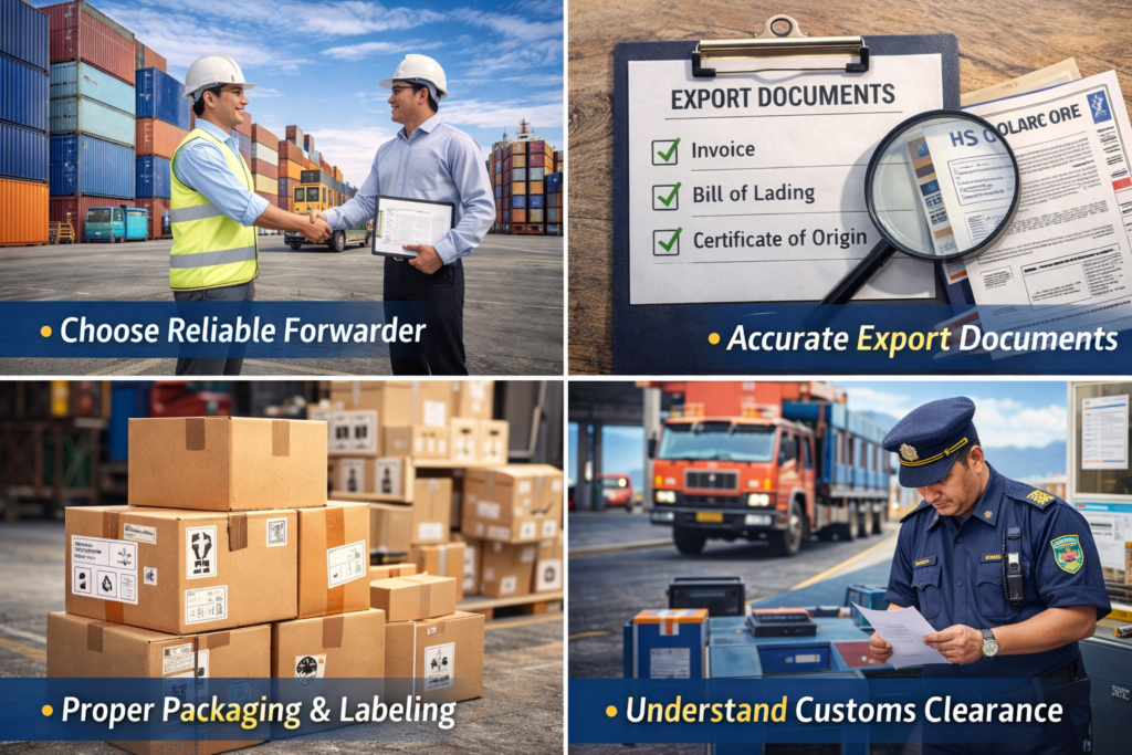 Ensure proper documentation, classify goods correctly with HS codes, avoid prohibited items, and work with experienced freight forwarders or customs agents. Planning shipments in advance also helps.